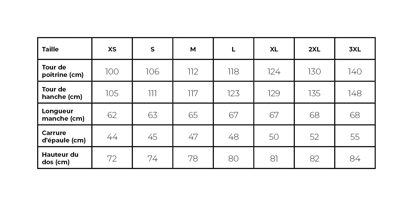 - Longueur de manche et carrure d’épaule : Ces mesures garantissent un ajustement confortable aux bras et aux épaules, essentiel pour une bonne liberté de mouvement.