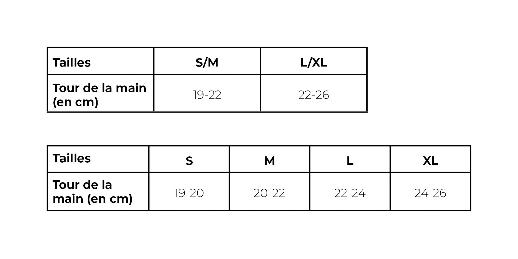 - Notez la mesure en centimètres et consultez le tableau ci-dessous pour déterminer votre taille de gants.