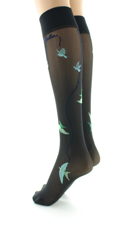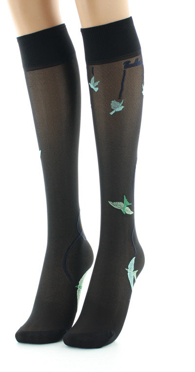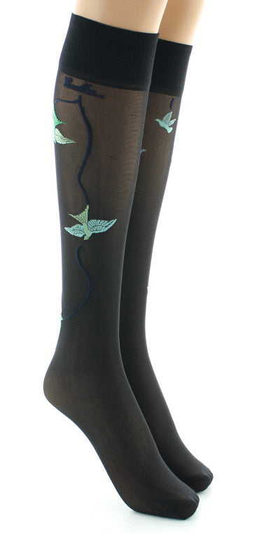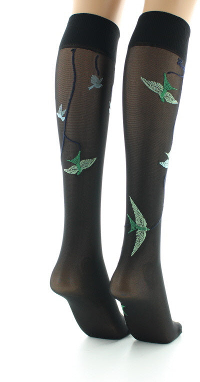 Le tissage de nos mi-bas 30 Deniers est le même que celui de nos collants, en double guipage : l'âme du Lycra est en quelque sorte entourée de 2 fils de Lycra supplémentaires pour une solidité plus importante. Résultat supplémentaire : la maille s'étire et se positionne facilement sur la jambe et le toucher est doux et velouté. Les pointes sont renforcées pour durer plus longtemps. L'élastique en haut de la tige du mi-bas est non comprimant mais lui permettra de ne pas descendre au cours de la journée. Un vrai bonheur ! Mais attention toutefois, un accroc est vite arrivé... : enfilez-les doucement, et sans vos bagues ! Positionnez-les à votre gré sur vos jambes, alternez la jambe gauche et la jambe droite... Libre à vous de les porter comme bon vous semble ! Extrêmement féminins, ils se feront discrets sous votre pantalon. Ces belles hirondelles habilleront vos jambes tout en élégance et légèreté. Sur un fond noir, les hirondelles asymétriques de couleur verte et bleu ciel volent gracieusement de bas en haut. Nos mi-bas sont et seront toujours entièrement confectionnés en France.